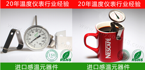 當森垚儀表業務員接到這個客人的電話時,就感覺他是一個細心的人,為什么這么說呢!他剛開始不知道想要的是一款什么樣的溫度計,就只知道是使用在咖啡壺上的溫度計,當他把自己需要使用的溫度范圍、想要的溫度計尺寸、外觀、大小、想達到什么效果等等一些問題給我們說了以后,才知道這位客人需要一款PT型的雙金屬溫度計,所以我們就把我們類似的食品溫度計PT1435的圖片給他看了一下。