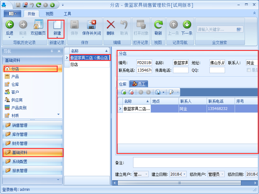 傲藍(lán)家具銷售管理系統(tǒng)連鎖管理建立分店的操作管理: