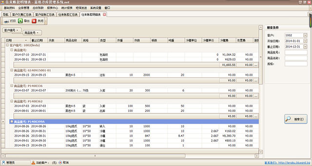 搜索條件有【客戶】【開始日期】【截止日期】【商品批號(hào)】【商品名稱】【規(guī)格】如下圖: