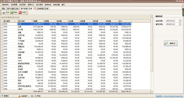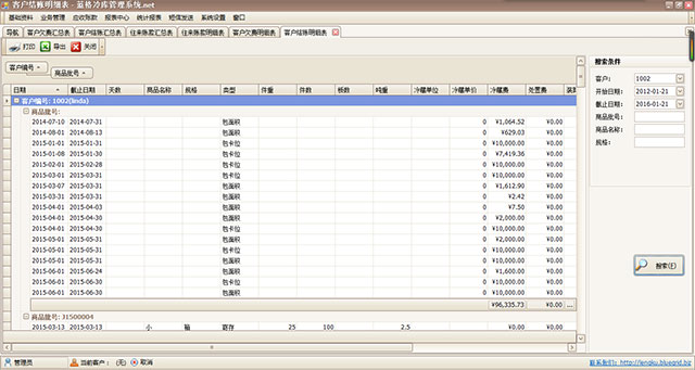表示2012-01-21~2016-01-21期間1002這個(gè)客戶所有已收記錄。每條記錄表示一個(gè)冷藏費(fèi)或雜費(fèi)記錄。