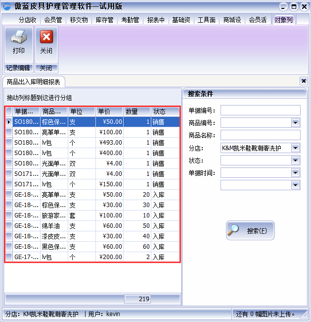 彈出商品出入庫明細(xì)報(bào)表就可以查看到商品狀態(tài)及明細(xì)還可以打印,此外,還可以根據(jù)商品的資料或出入庫的時(shí)間進(jìn)行查詢,更精細(xì)化的監(jiān)控好商品出入庫的情況,全面管理整個(gè)皮具護(hù)理店鋪。如圖:
