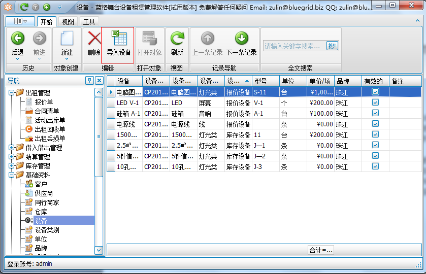 傲藍舞臺租賃管理軟件快速導入設備資料(包括設備的編號、設備的名稱、設備的類別、設備的種類、設備的單位、設備按場或按天的租金收費標準、設備的品牌、設備的型號。)這些內容。具體操作如下: